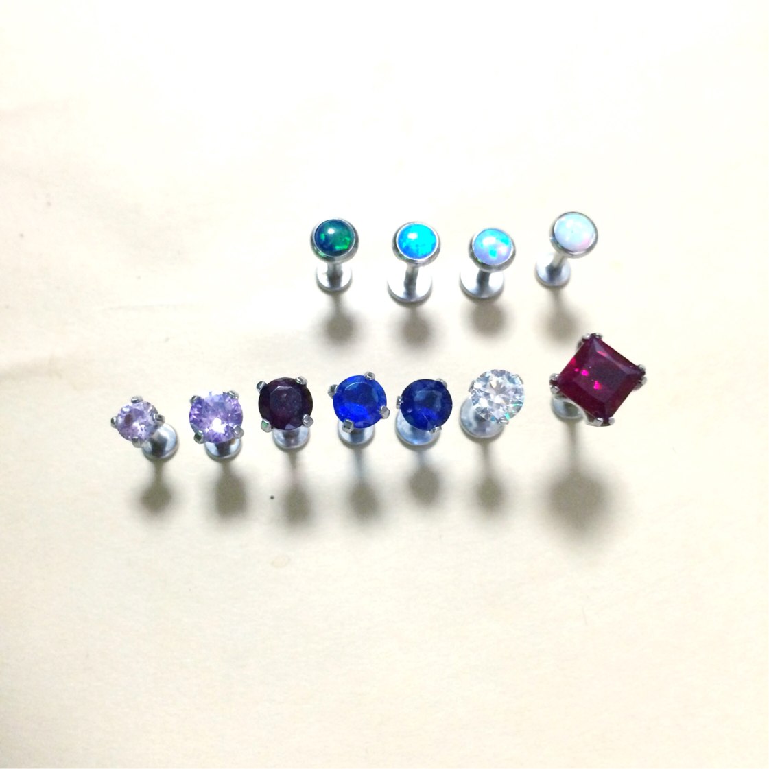 色は左からタンザナイト(これのみ4mm他5mm)、タンザナイト、パープル、ブルー。